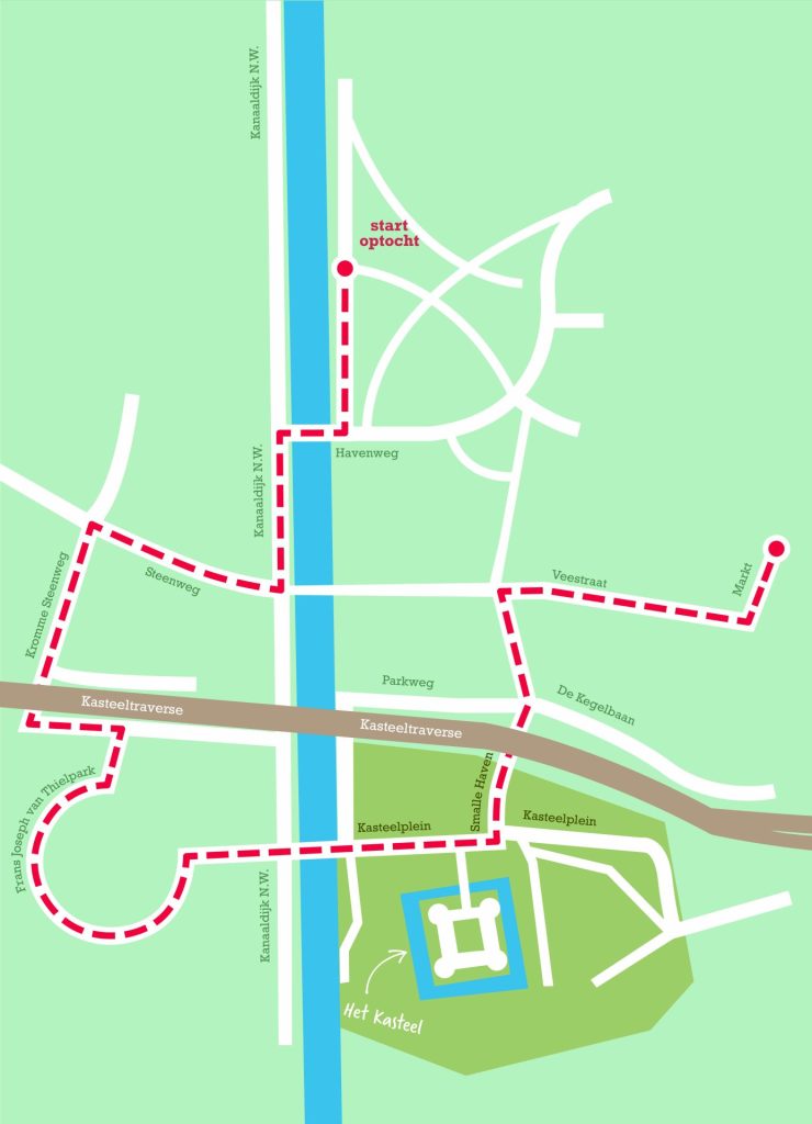 De route wordt vanaf het voorterrein van het Kasteel verder vervolgd richting de Oude Aa, Smalle Haven, richting de Veestraat. Vanaf de Veestraat loopt de route richting eindpunt op de Markt. Op de Markt gaat het programma weer verder.