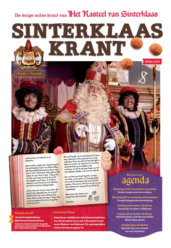 Als sponsor bieden we je de mogelijkheid om met 15% korting te adverteren in de Sinterklaaskrant. Deze wordt op half-dagbladformaat in een oplage van 36.000 stuks op alle scholen in Helmond en wijde omgeving uitgereikt. En er liggen exemplaren op verzamelplekken. Als adverteerder krijg je 4 kaarten beschikbaar gesteld voor de relatieavond die altijd op de eerste donderdag dat het kasteel open is, staat gepland. Hierin wordt geen onderscheid gemaakt voor het formaat van de advertentie waarvoor wordt gekozen.